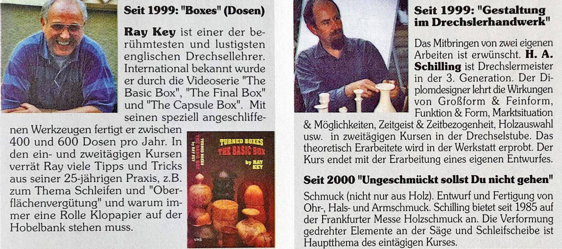 In unserem neugebauten Kurszentrum im Finkenweg 11 bieten wir zur Jahrtausendwende bereits 9 Kurse mit Gastdozenten aus dem In- und Ausland an. Besondere Neuheiten in diesem Jahr sind die Kurse: „Materialkombination – mit Florian Scharf“; „Nassholztechniken – mit Mic O’Donnell“ und „Ovaldrehen – mit Johannes Vollmer“.