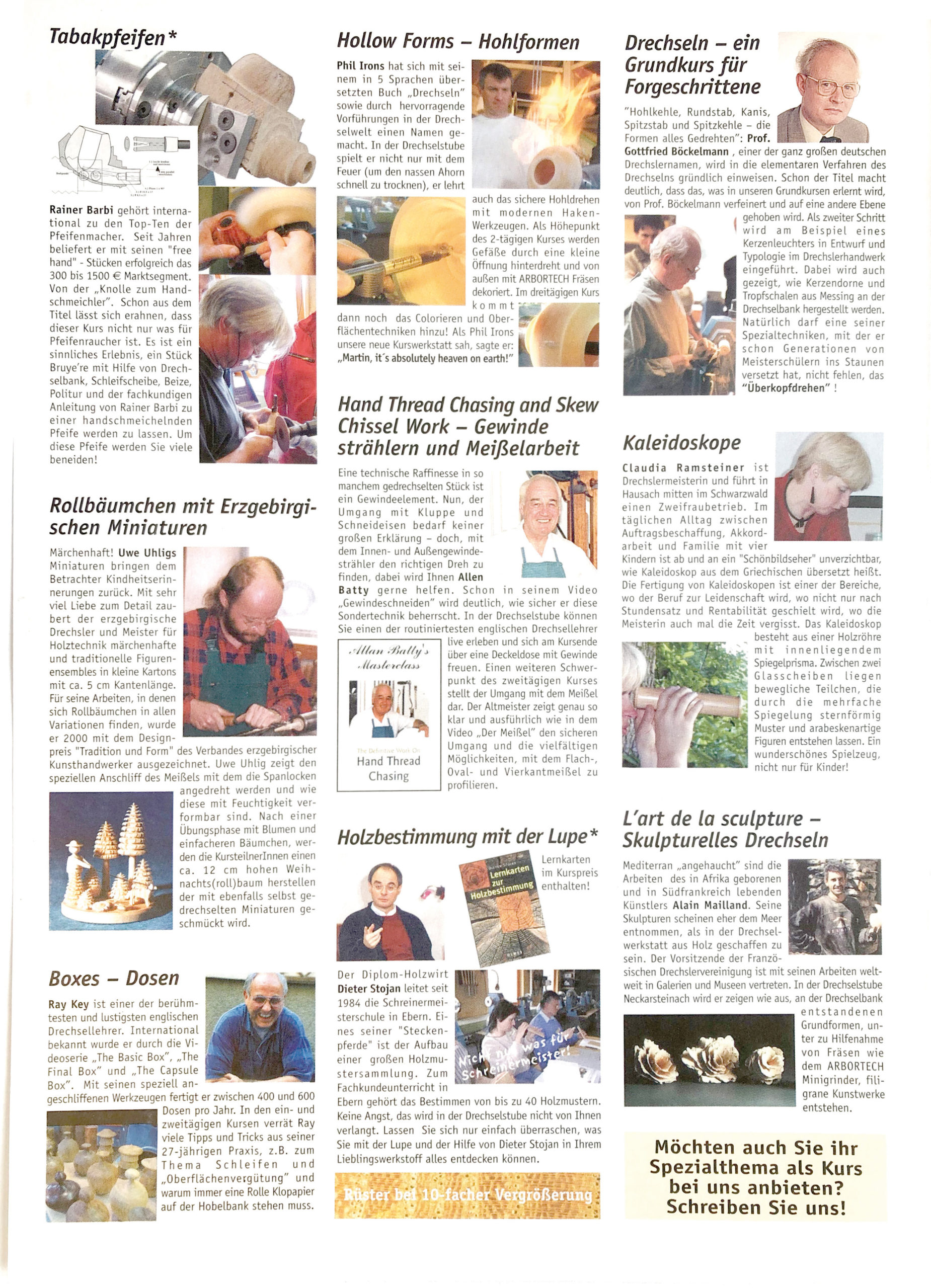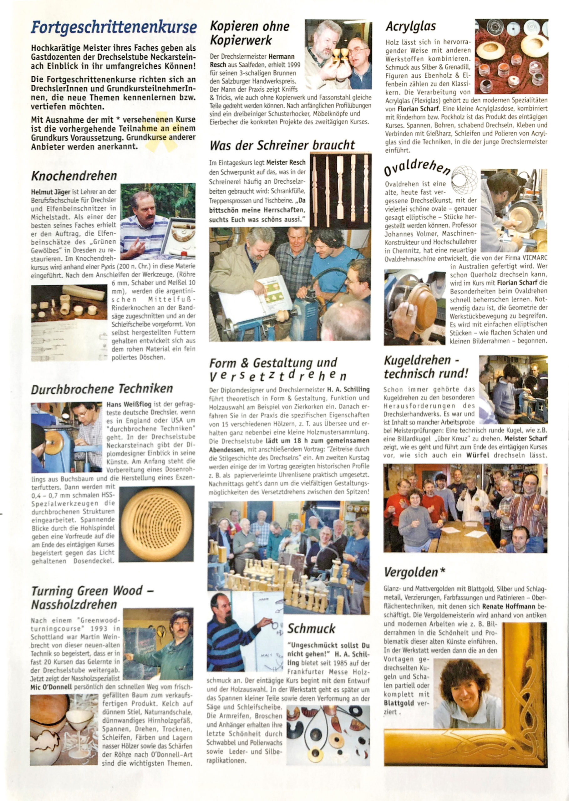 Erstmals bieten wir zu unserem Grundkurs einen Fortgeschrittenenkurs mit Schwerpunkt Schalen und Dosen an. Im Magazin Drechseln erscheint erstmals ein Bericht über unser Drechselkursangebot.