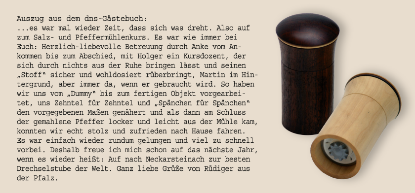 Der Kurs „Pfeffer- und Salzmühlen“ mit Holger Graf bringt erstmals die GrushGrind-Keramikmahlwerke in die dns-Kurswerkstatt.