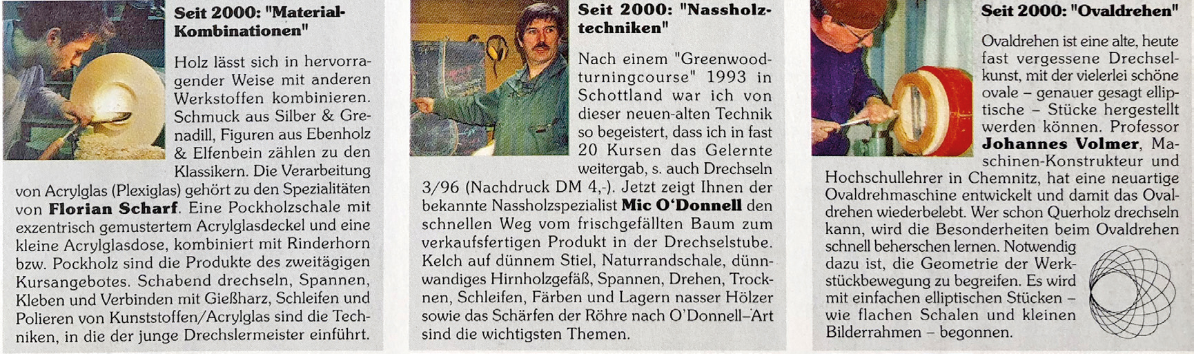 In unserem neugebauten Kurszentrum im Finkenweg 11 bieten wir zur Jahrtausendwende bereits 9 Kurse mit Gastdozenten aus dem In- und Ausland an. Besondere Neuheiten in diesem Jahr sind die Kurse: „Materialkombination – mit Florian Scharf“; „Nassholztechniken – mit Mic O’Donnell“ und „Ovaldrehen – mit Johannes Vollmer“.