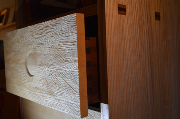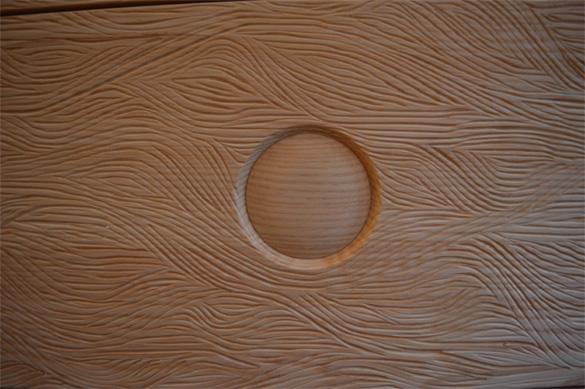 Ich hatte die Idee, eine gedrechselte und fein geschliffene konvexe Kreisfläche in die Mitte der Schubkastenvorderstücke zu drechseln. Diese Fläche steht im Kontrast zu den geschnitzen Strukturen, die sie umgeben, lädt zum Berühren ein; dadurch wird dann der Mechanismus zum Öffnen der Schubkästen ausgelöst Die in dem „hollow forms“ Kurs mit Phil Irons gefrästen Strukturen fand ich super, sie lassen sich toll auf gedrechselten Formen anwenden, nicht aber auf einer Fläche. Schließlich habe ich die wellenförmige Struktur mit einer Schnitzmaschine aufgebracht.