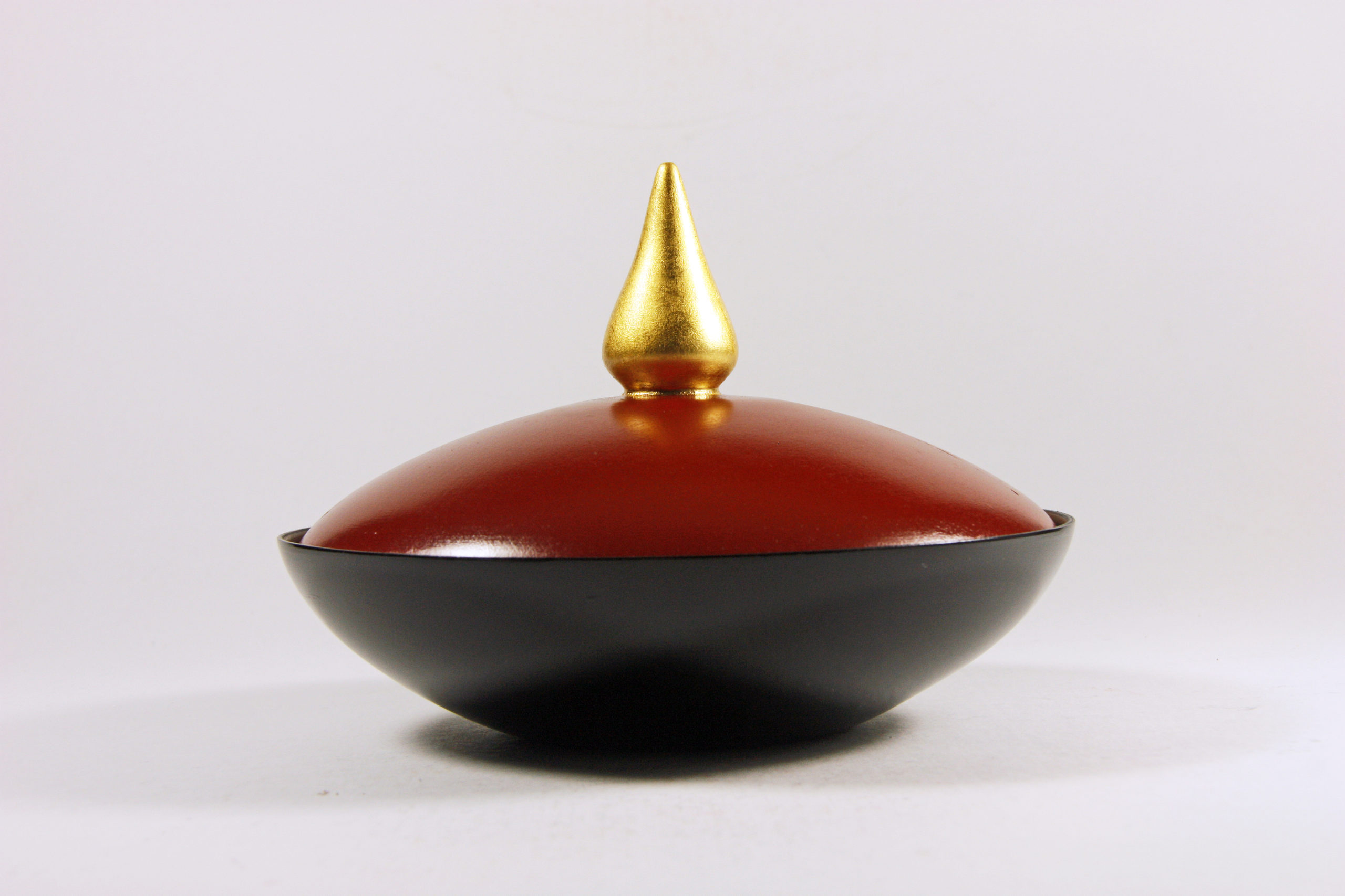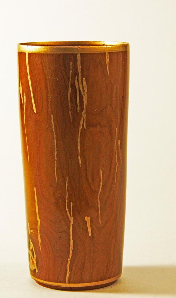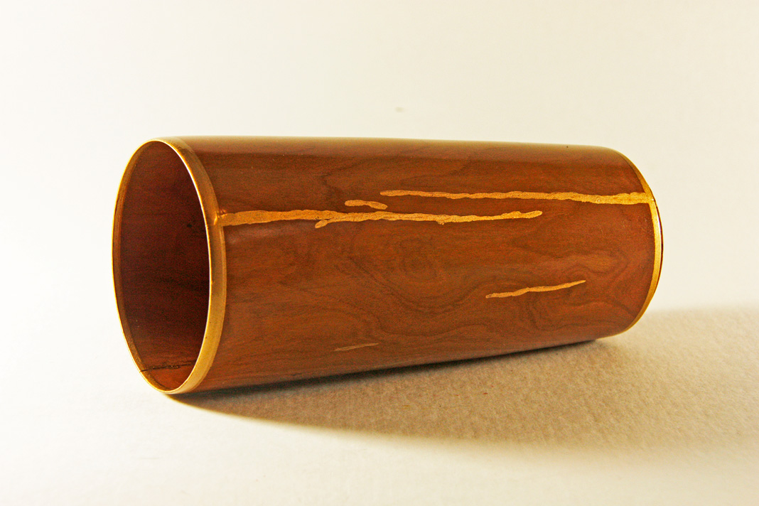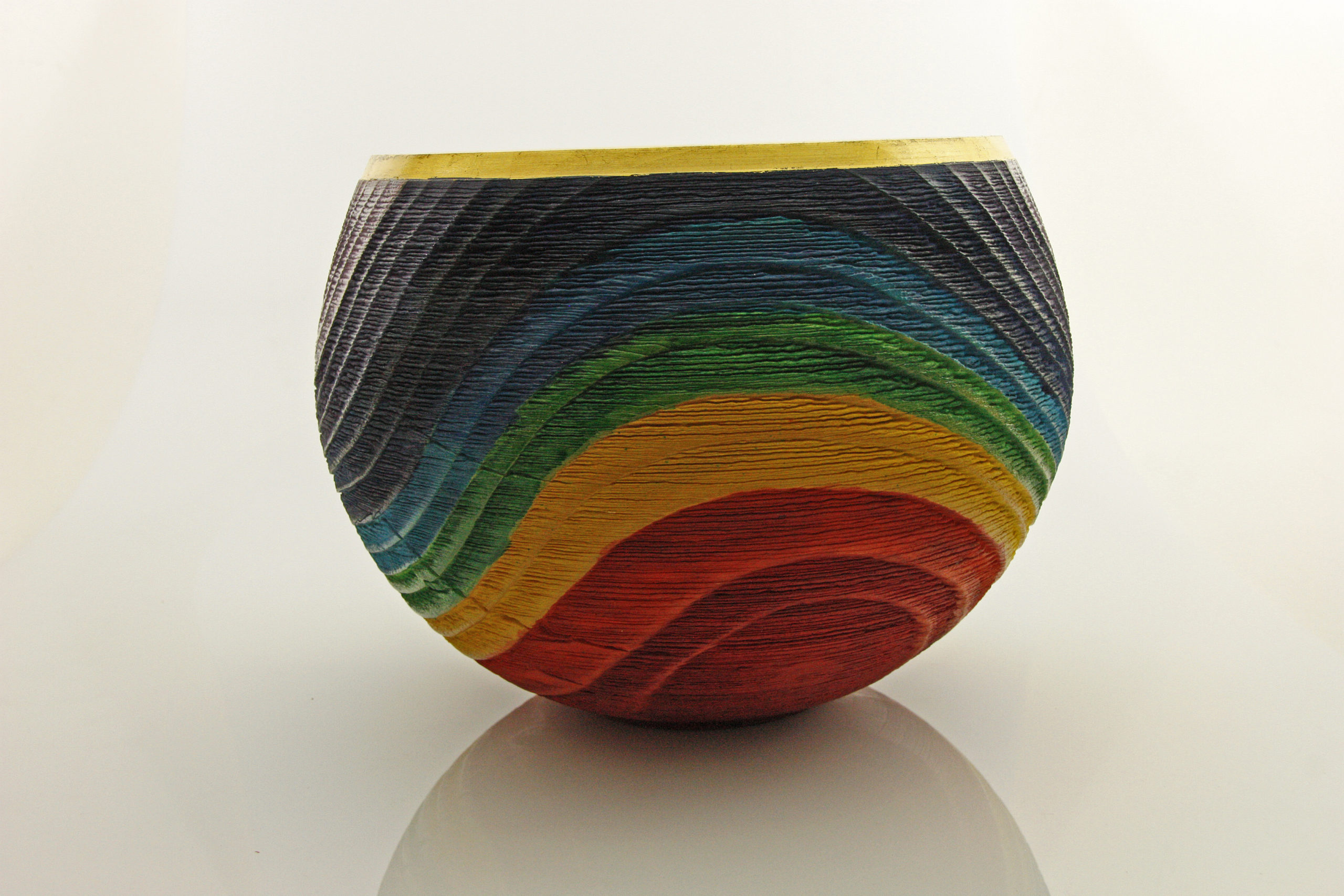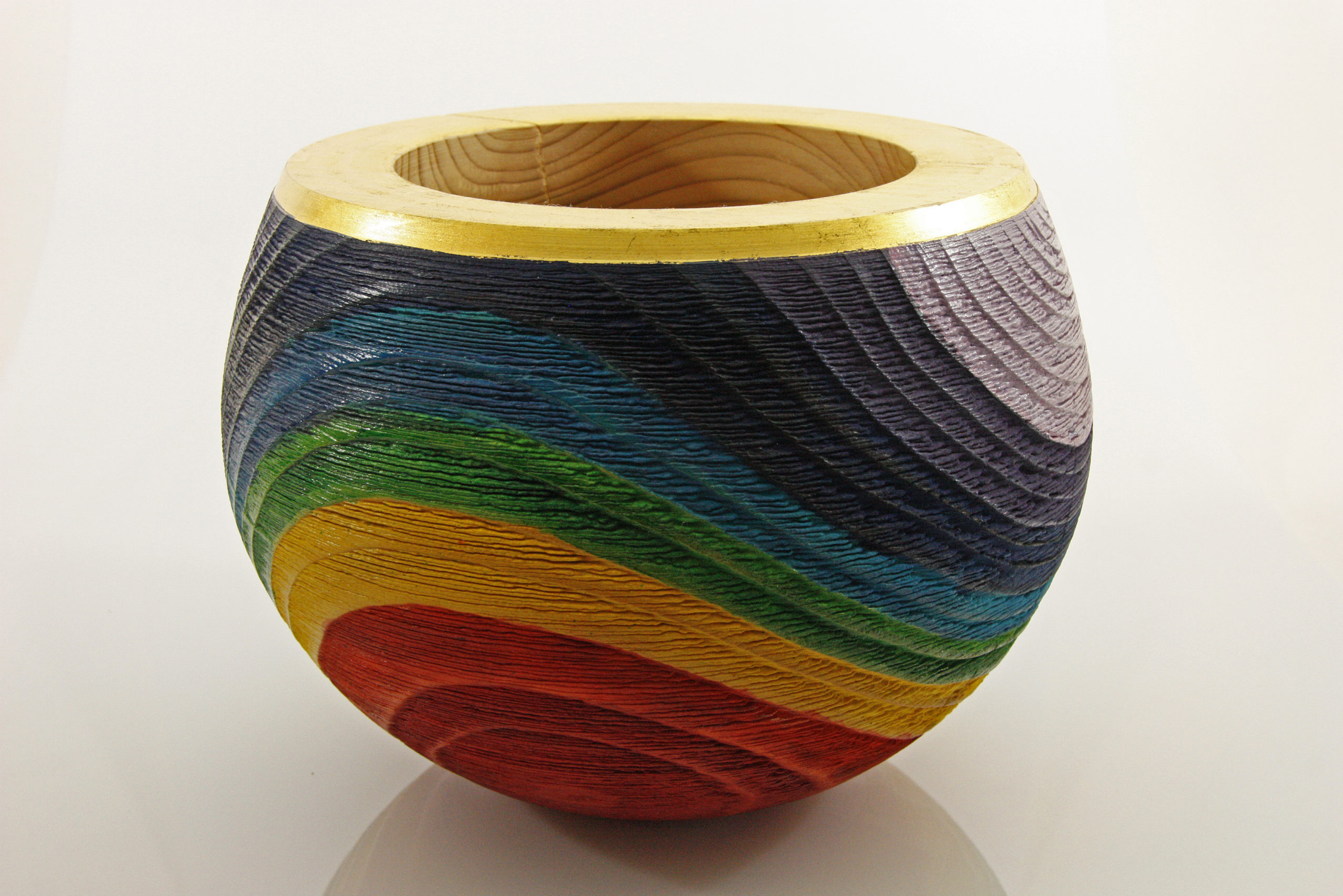 Beide, der Schriftsteller und der Maler drücken das aus, was mich veranlasste, dieses sehr trockene und rissige Holz einer Zeder (das ich mir schon für den Ofen überlegte) mit den Farben des Regenbogens zu schmücken um zu zeigen, dass auch solche Hölzer noch bearbeitbar sind. Und deshalb gab ich auch der Schale den Namen „Color of Life“. Zeder h = 18 cm / Ǿ = 21 cm, Oberfläche:Chestnut Spirit Stain, – Blattgold 24 Karat, Finish: Chestnut Acrylic Gloss Lacquer