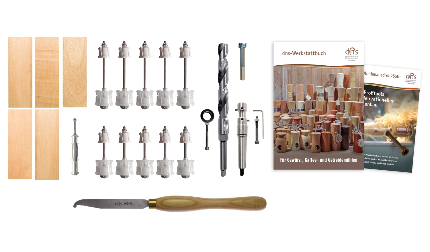 mit Holz und Mahlwerken für 10 Pfeffermühlen und Salzmühlen