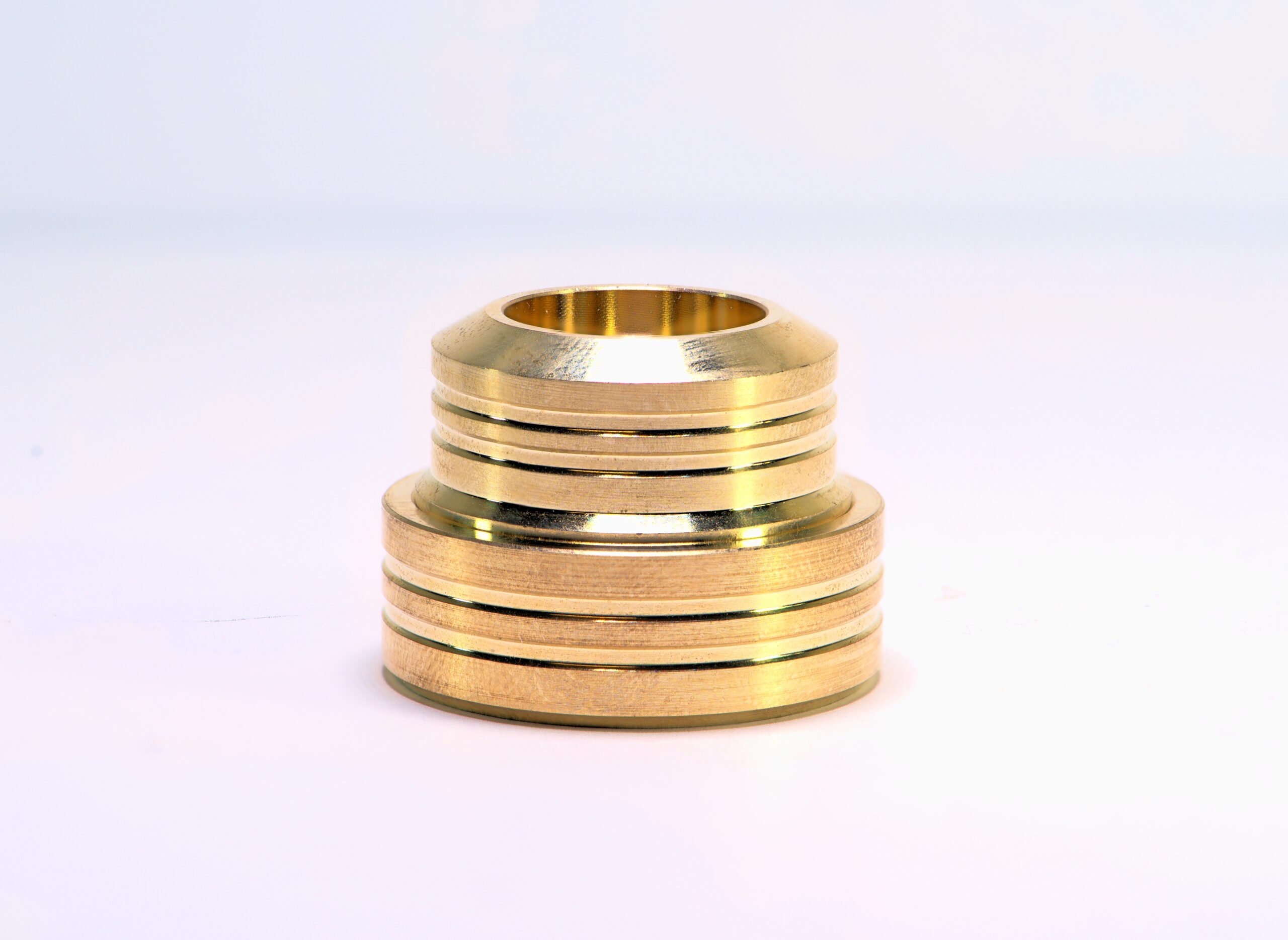 Um das Oberteil des Messinggewindes einzubauen, wird die 25mm Startbohrung so angefast, dass der kleine Zentrierbund dort anliegen kann. Das Unterteil (Gewindering) hat einen Durchmesser von 31mm. Die 25mm Startbohrung kann mit einem Standardkegelsenker #2294, oder mit unserem Mühlenausdrehkopf dns-MAK eingebracht werden.
