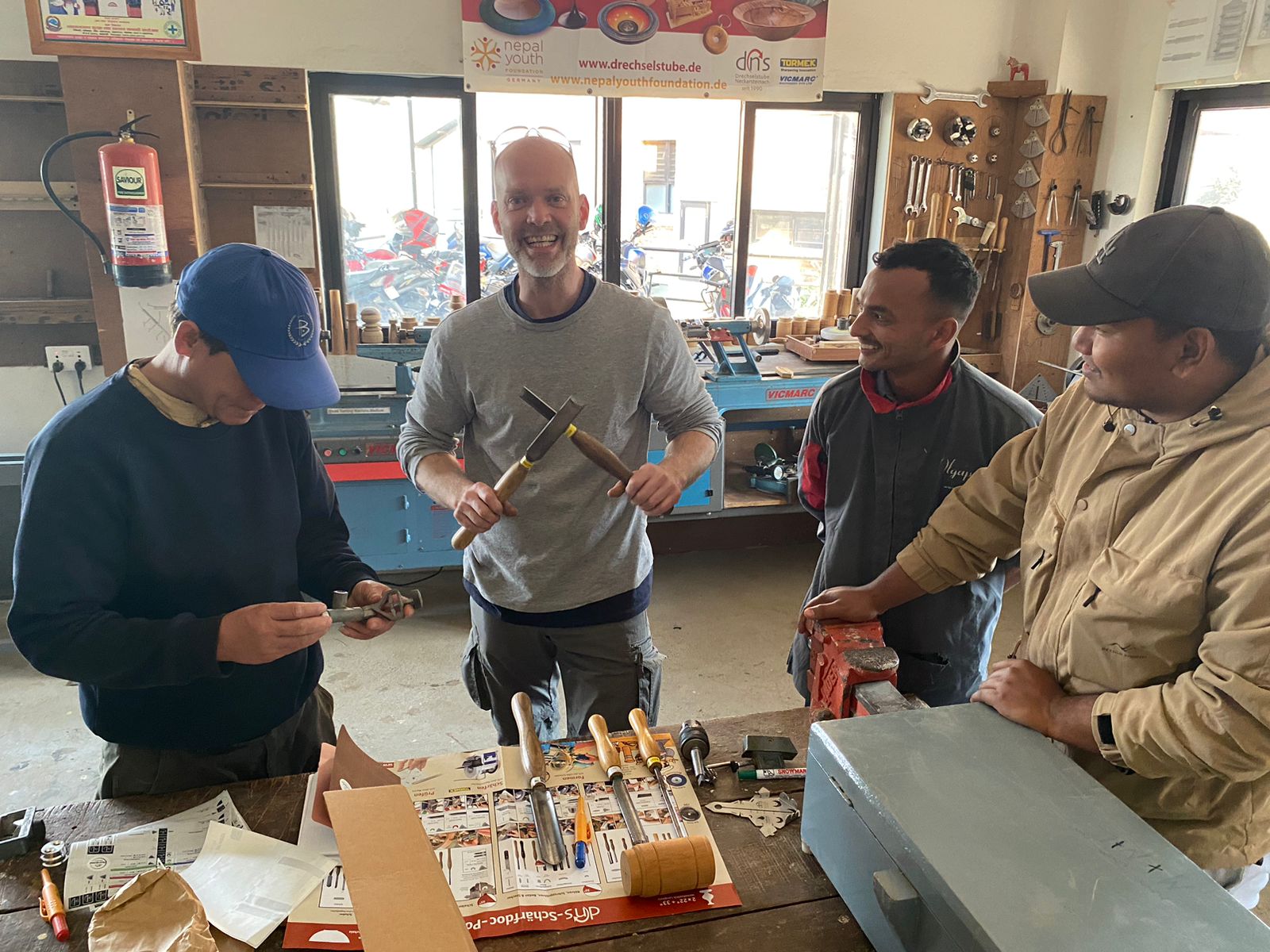 Seit 2017 läuft der Ausbildungsbetrieb und mittlerweile werden 8 weibliche und 6 männliche Azubis an der Drechselbak ausgebildet. Unter dem Motto „Nachschub für Olgapuri“ konnten wir im November 2017 ein großes Werkzeug und Zubehörpaket im Wert von 7.500,- auf den Weg nach Nepal bringen.